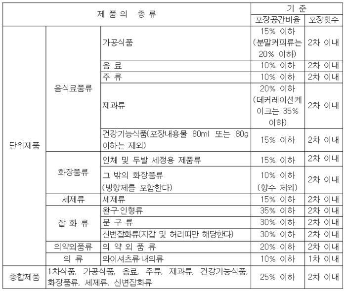 한편 포장 방법에 대한 기준은 제품 종류별로 다르므로 포장 전 반드시 확인해야 하며 자세한 내용은 아래의 표를 확인하면 된다.