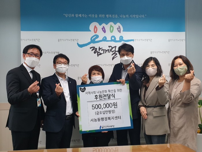 | ▲서농동 주민자치위원회에서 수지노인복지관에 50만원을 기탁했다. 용인시 제공 |