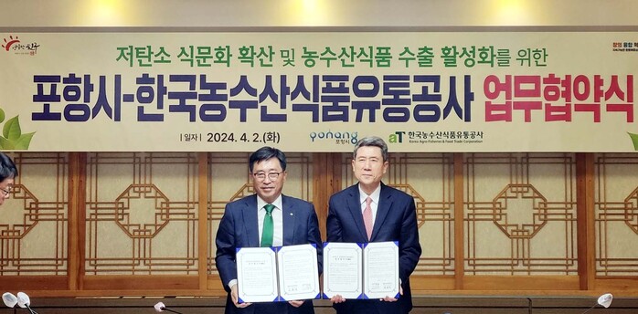 한국농수산식품유통공사(사장 김춘진)와 포항시(시장 이강덕)는 2일 포항시청에서 저탄소 식생활 확산과 K-푸드 수출 확대를 위한 업무협약을 체결했다.
