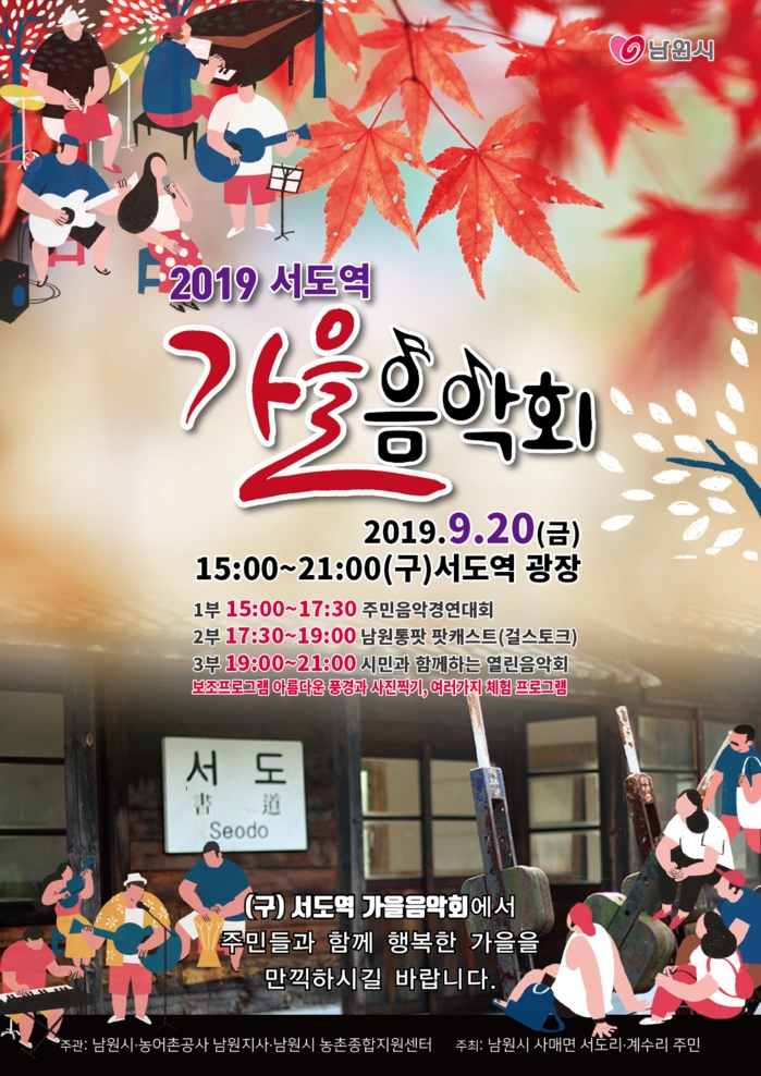 이날 오후 3시부터 9시까지 진행되는 음악회는 총 3부로 구성돼 있으며, 1부에는 서도리 주변마을 주민들의 숨은 재능을 뽐내는 시간으로 주민들의 음악경연과 장기자랑이 진행되며, 2부에는 남원통팟 팟캐스트 라이브라디오 방송이 진행된다.