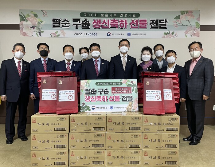 [로컬세계 부산=맹화찬 기자]부산지방보훈청은 26일 오후 부산보훈청 백재덕실에서 (사)대한민국팔각회와 함께 제10회 보훈가족 건강기원 팔순구순 생신축하 선물(정관장 홍삼선물세트 500만원 상당) 전달식을 가졌다.