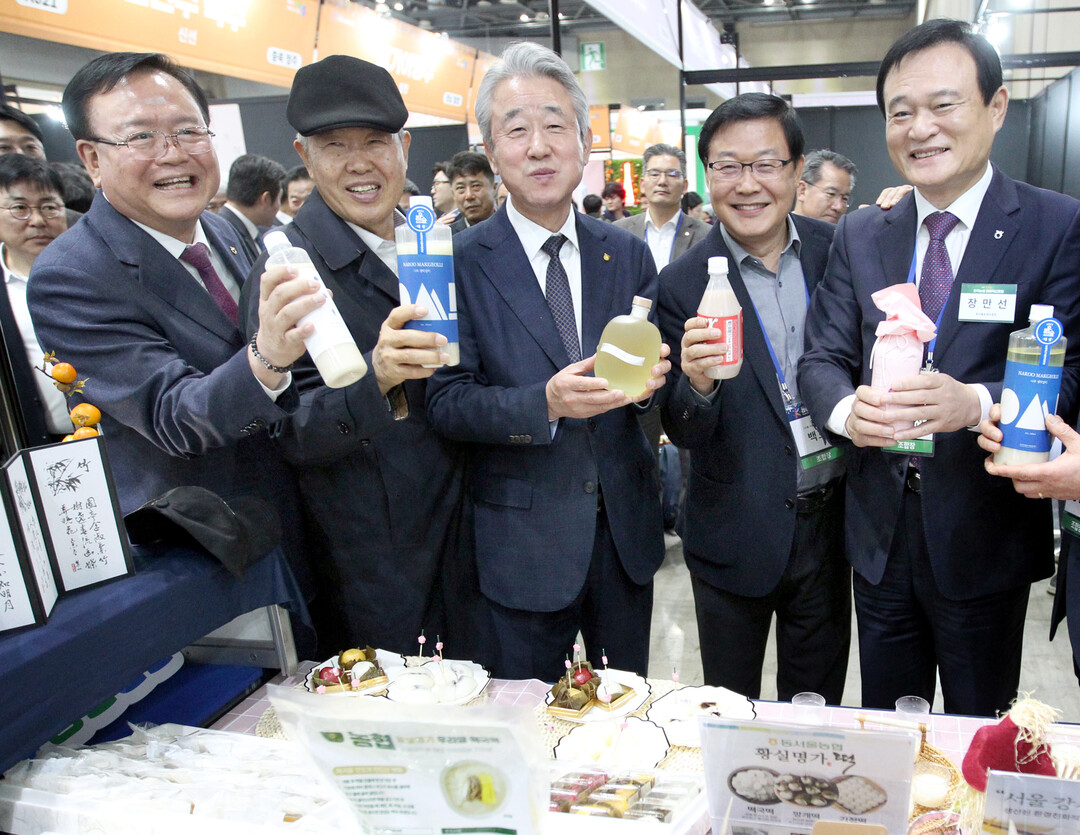 강호동 농협중앙회장이 서울지역 조합장들과 전시장 순람을 하고 있다. (왼쪽부터) 남서울농협 안용승 이사 조합장, 서울축산농협 진경만 이사 조합장, 강호동 회장, 영등포농협 백호 조합장, 동서울농협 장만선 조합장