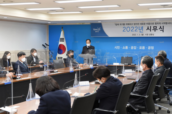 [로컬세계 이혁중 기자]경기 양주시(시장 이성호)는 지난 3일 시청 상황실에서 ‘2022년 임인년(壬寅年) 시무식’을 열고 ‘코로나19·지역경제 극복, 신성장 미래도시 도약’을 준비하는 새해 힘찬 첫 발걸음을 내디뎠다.