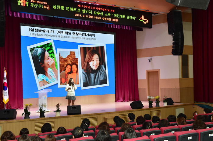 | ▲지난해 3월 8일 ‘세계여성의 날’ 기념 수원시청 대강당에서 열린 ‘성인지 감수성 교육’ 모습. 이은 여성인권변호사가 공직자·시민을 대상으로 강연하고 있다.(수원시 제공) |