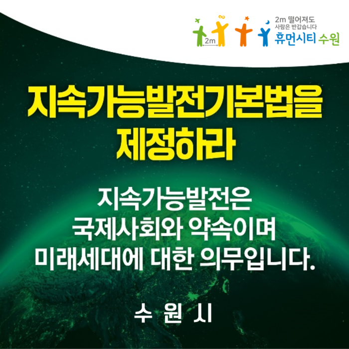 염태영 시장은 26일 개인 SNS에 글을 게시하고, “수원시는 ‘지속가능발전 지방정부협의회’의 일원으로서 현세대와 미래세대 모두의 행복을 지켜가기 위한 ‘지속가능발전기본법’ 제정을 촉구한다”고 말했다.