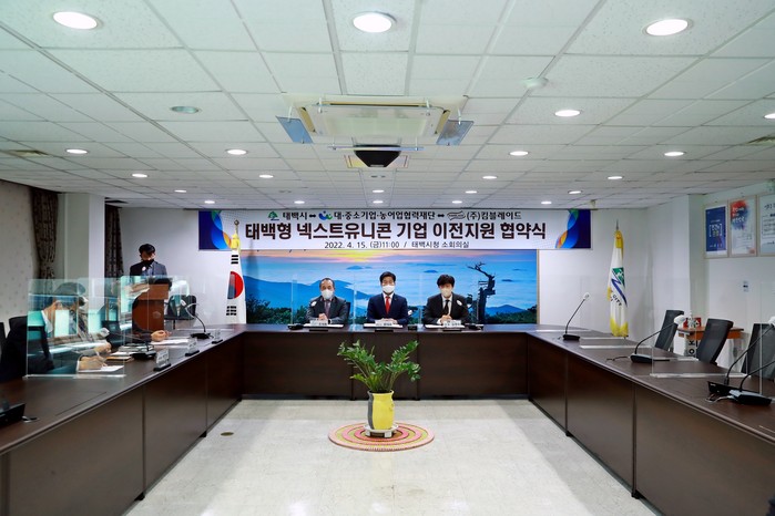 [로컬세계 박상진 기자]강원 태백시는 15일 시청 소회의실에서 대·중소기업·농어업협력재단(사무총장 김영환), ㈜킴블레이드(대표 김형우)와 ‘태백형 넥스트 유티콘 기업 이전지원’ 업무협약식을 가졌다.