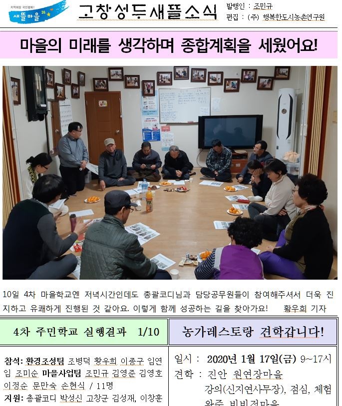 성두마을 소식지는 새뜰마을 공모사업의 일환으로 추진됐다. 고창군과 성두마을은 지난해 국토부 새뜰마을 공모에 선정돼 총사업비 37억1400만원을 들여 2022년까지 생활위생 인프라 확보와 노후주택 정비지원 사업, 주민역량 강화사업 등을 펼친다.