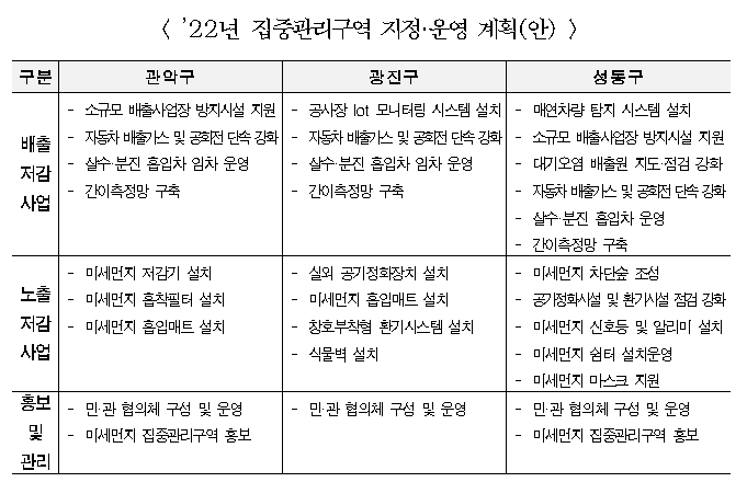 서울시는 지난해 금천·영등포·동작·은평·서초·중구 6곳을 미세먼지 집중관리구역으로 지정한데 이어 올해 자치구별 지역 특성에 맞는 미세먼지 집중관리구역을 확대 지정하기 위해 지난 3월 자치구 대상으로 수요조사와 전문가 현장평가를 실시, 관악·광진·성동구 3곳을 지정 후보지역으로 선정했다.