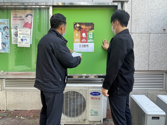 ▲동래소방서 한 관계자가 '국민안전 3원칙' 홍보용 포스터를 부착하고 있다. 동래소방서 제공 |