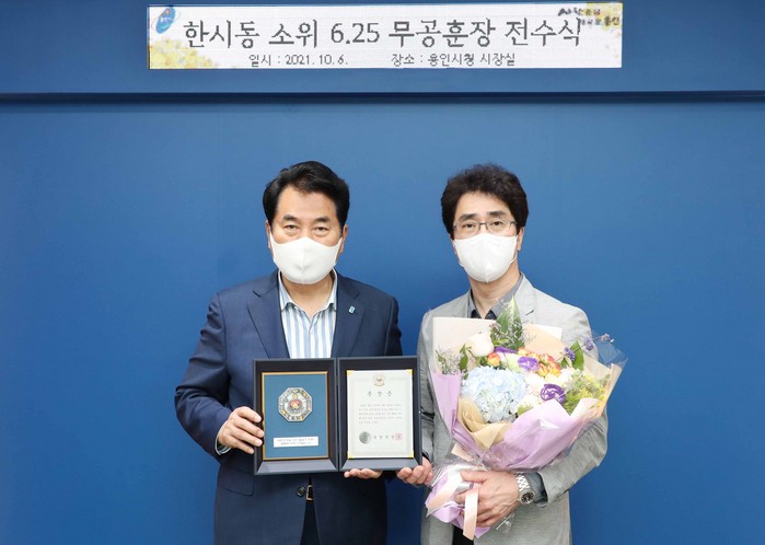 이날 백군기 시장은 용인시청 시장실에서 열린 전수식에서 국방부를 대신해 6·25전쟁 당시 101근무사단 소속 소위로 복무하며 나라를 위해 싸운 한시동 옹의 자녀 한경석(59) 씨에게 훈장과 꽃다발을 전달하고 감사 인사를 전했다. 한시동 옹이 거동이 불편해 전수식에 참석하지 못한 관계로 자녀 한경석 씨가 전달받은 것이다.