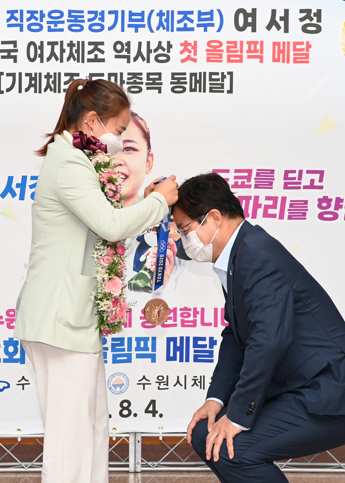 수원시는 4일 오후 5시 수원시청 로비에서 여서정 선수의 동메달 봉납 및 포상금(3천만원) 전달식을 개최했다.