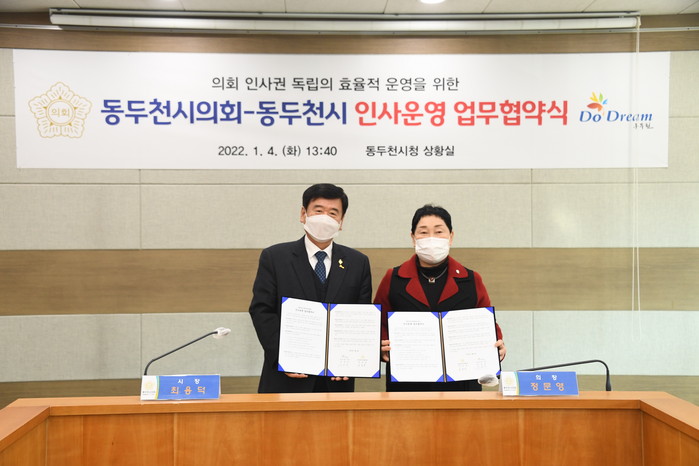 [로컬세계 이혁중 기자]경기 동두천시의회(의장 정문영)와 동두천시(시장 최용덕)는 4일 동두천시청 상황실에서 지방의회 인사권 독립의 조기정착과 효율적 운영을 위한 '인사운영 업무협약'을 체결했다.