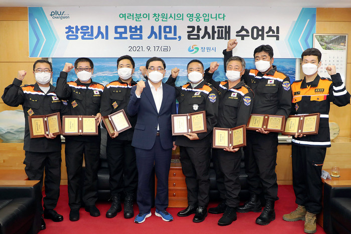 [로컬세계 권인진 기자]경남 창원시는 17일 오후 4시 접견실에서 지난달 28일 진해구 명동 소고도(소쿠리섬)에서 발생한 익수사고에 즉각 대응해 소중한 생명을 구해낸 한국해양구조협회 마산구조대원들에게 감사패를 수여하고, 창원시민을 대신해 감사의 마음을 전했다.
