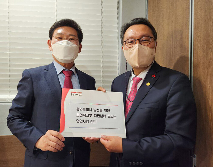 이 시장은 7일 저녁 서울에서 박민수 보건복지부 2차관을 만나 ‘용인특례시 발전을 위해 보건복지부 차관께 드리는 현안 사항 건의문’을 전달했다.