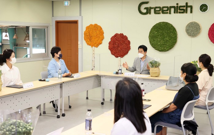 | ▲백군기 시장이 (주)그리니쉬를 방문해 제1기 복지원예사 양성과정 수료생들과 사회적 농업과 관련된 이야기를 나누고 있다. |
