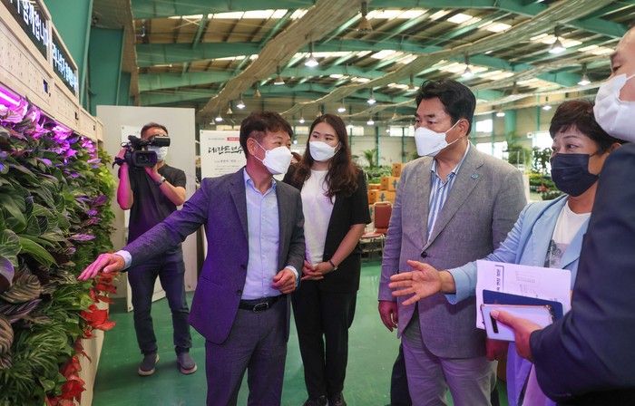 | ▲백군기 용인시장이 30일 처인구 남사면 (주)그리니쉬를 방문해 사회적 농업 활성화 교육 현장을 둘러보고 교육생들을 격려했다. 용인시 제공 |