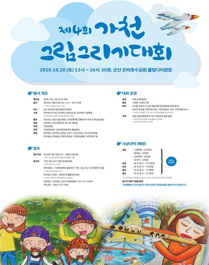 전라북도의 아름다움을 느끼고 소중함을 알리기 위한 목적으로 기획된 제4회 가천 그림그리기 대회는 내달 20일 ‘군산 은파호수공원 물빛다리광장’에서 열린다.