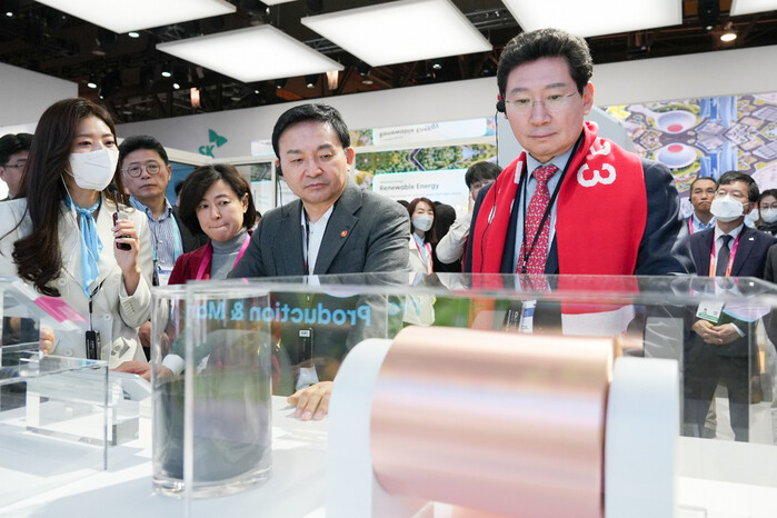 원 장관과는 SK관을 함께 둘러봤다. SK는 초고속 저전력의 시스템 반도체인 '사피온' 등을 선보이면서 2030년에 세계 탄소배출량의 1%에 해당하는 2억톤의 탄소 배출량을 줄이겠다고 밝혔다.