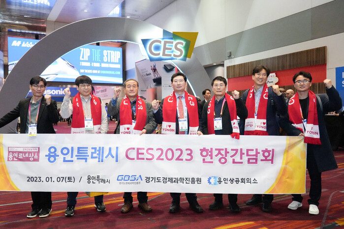▲ 이상일 용인특례시장이 미국 CES를 찾아 관계자들과 기념 촬영을 하고 있다. |
