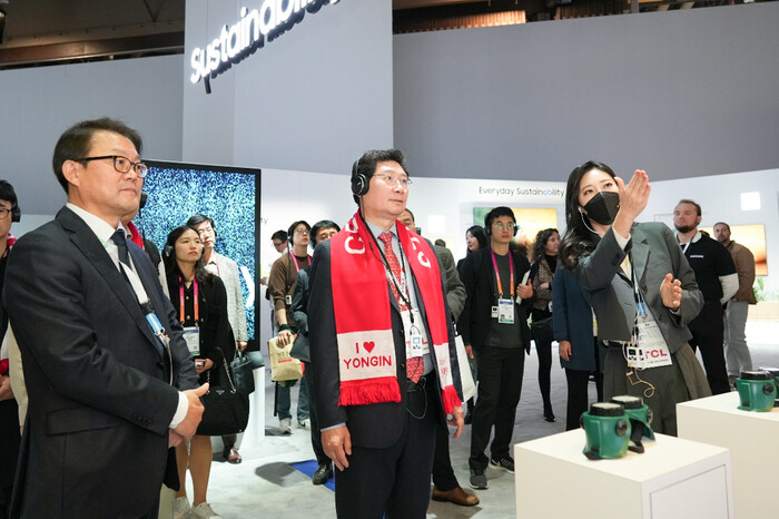 ▲ 이상일 용인특례시장이 박승희 삼성전자 CR담당 사장(왼쪽)의 안내를 받아 삼성관을 살펴보고 있다. |