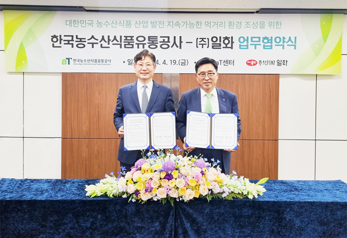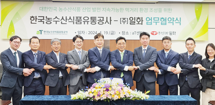 한국농수산식품유통공사(사장 김춘진)는 19일 서울 양재동 aT센터에서 ㈜일화(대표이사 김윤진)와 지속가능한 먹거리 환경조성과 대한민국 농수산식품 산업 발전을 위한 업무협약을 체결했다.