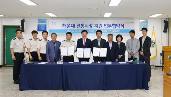 [로컬세계 맹화찬 기자]부산 해운대소방서는 16일 해운대구청 5층 대회의실에서 해운대구청장과 한전 남부산지사장, 해운대시장 상인회장과 함께 더 찾고싶고 더 안전한 전통시장을 조성하기 위한 유관기관 업무 협약을 체결했다고 밝혔다.