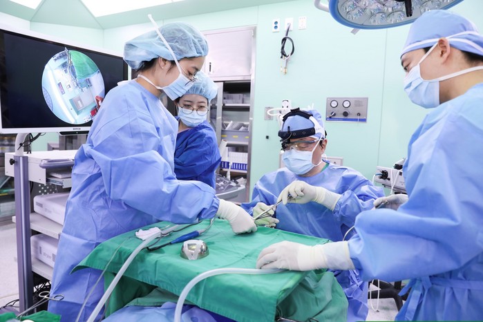▲ 한림대학교동탄성심병원 이비인후과 박일석 교수를 비롯한 의료진들이 편도 아데노이드 절제술을 진행하고 있다. |