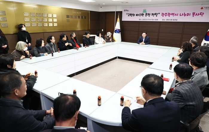 | ▲ 이상일 용인특례시장이 광주광역시 나누미봉사단과 대화를 나누고 있다. |