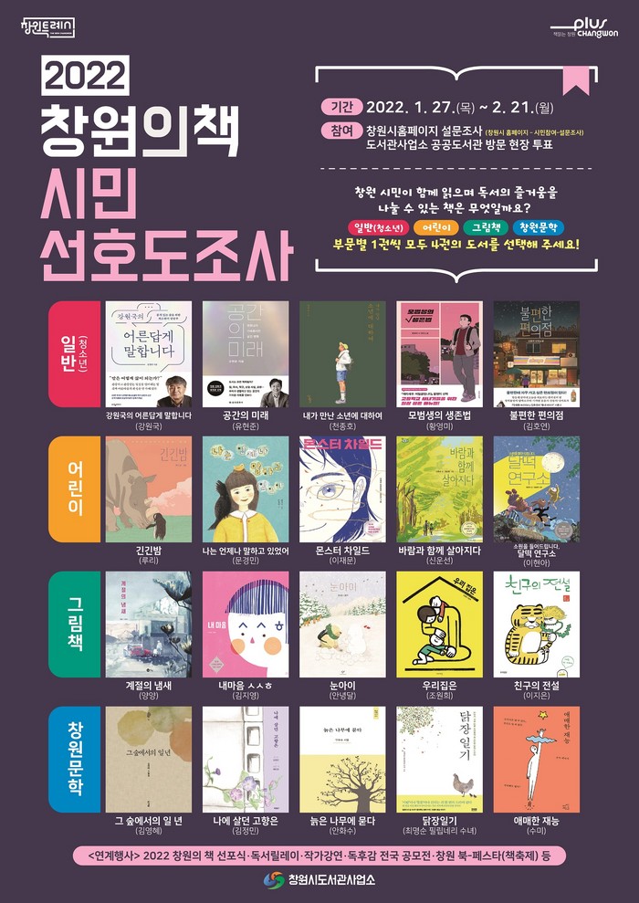 [로컬세계 한용대 기자]경남 창원시도서관사업소는 27일부터 2월 21일까지 26일간 '2022 창원의 책' 후보도서 20권에 대한 시민선호도조사를 실시한다.