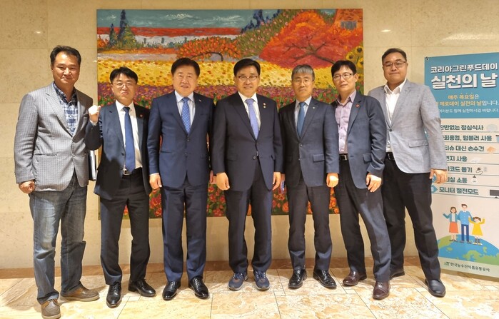 ▲ 한국농수산식품유통공사 김춘진 사장(우측4번째), 제주특별자치도 오영훈 도지사(좌측3번째) |