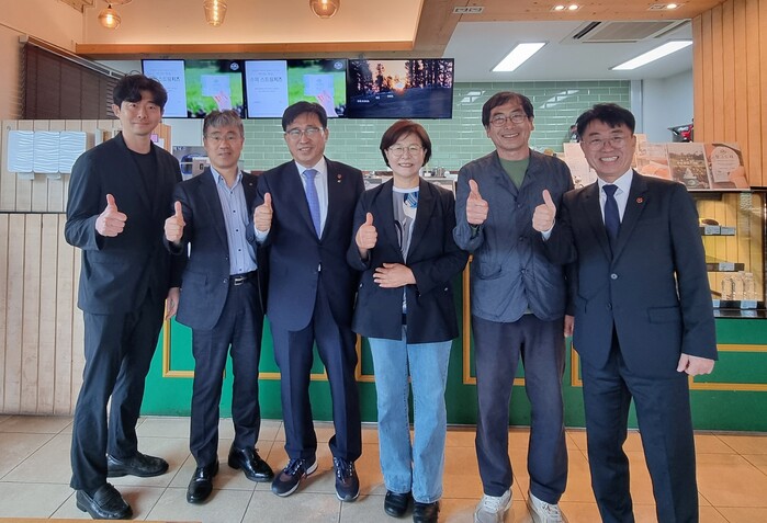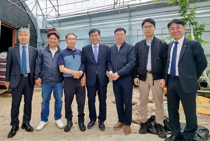 ▲ 농업회사법인(주)아침미소 목장 방문 사진. 한국농수산식품유통공사 김춘진 사장(좌측3번째), 농업회사법인(주)아침미소 양혜숙 대표(우측3번째), 아침미소목장 이성철 대표(우측2번째) /aT 제공 |