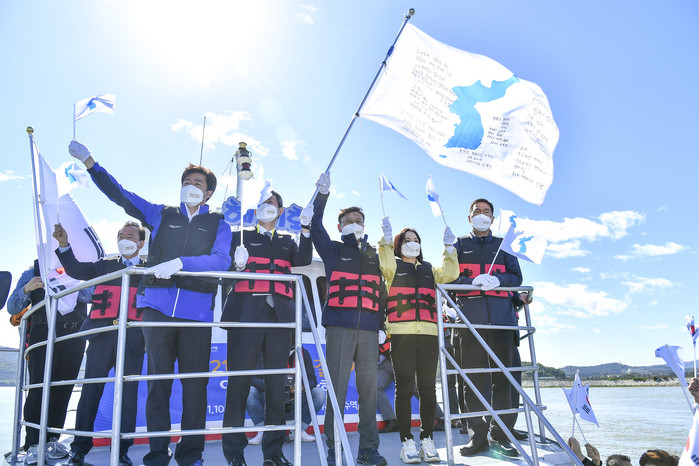 이어 한강하구 중립수역과 그 너머 북한의 송악산이 바라보이는 선상에서 태극기와 평화의 메시지를 담은 한반도기를 드높이 흔들며 조강에 평화의 물길이 열리고 남과 북 한민족이 함께 어우러져 한반도에 평화와 번영의 시대가 오기를 기원했다.