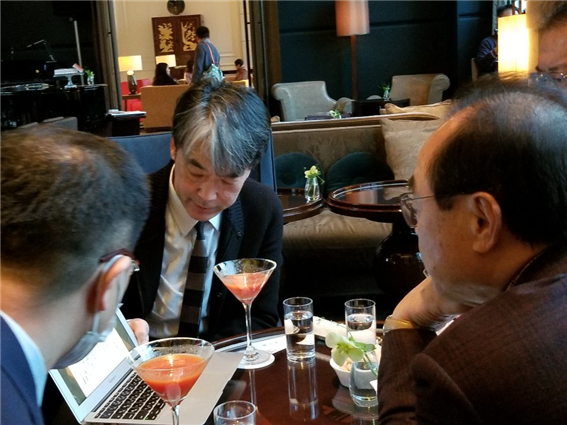 | ▲오거돈 부산시장이(오른쪽 끝) 오사카부립대학 대학원 하시즈메 신야 교수와 만나 엑스포 준비계획 등을 살펴보고 있다. |