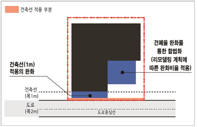 기존에도 '리모델링활성화구역' 내에서는 최대 30%까지 건폐율과 건축선 제한이 완화되는데, 서울시는 여기서 더 나아가 구역 지정시30% 한도 규정까지 적용 항목별로 폐지하기로 했다. 개별 인허가시 계획 및 대지 현황을 충분히 검토 후 현장 여건에 맞게끔 건축위원회 심의에서 그 비율을 결정할 수 있도록 개선하는 것.
