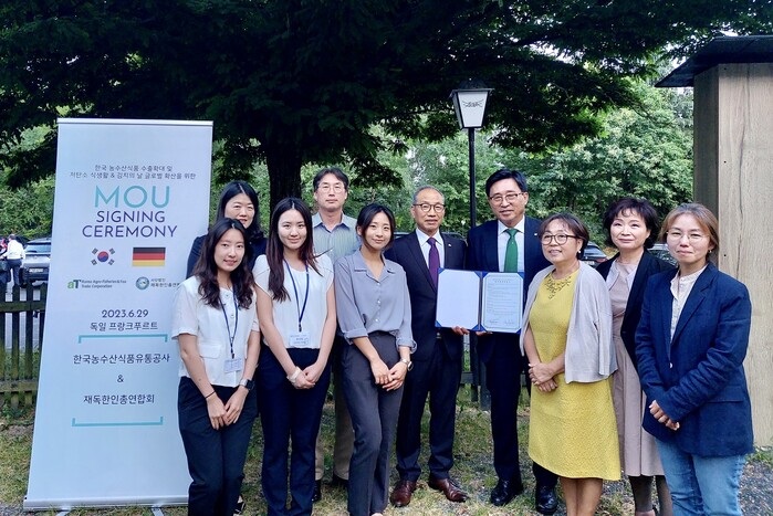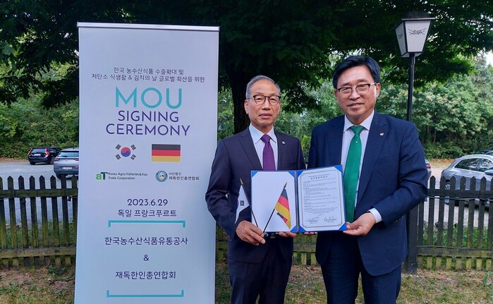 한국농수산식품유통공사(사장 김춘진)는 독일 현지시간 29일 프랑크푸르트에서 사단법인 재독한인총연합회(회장 정성규)와 함께 유럽지역 저탄소 식생활 확산과 글로벌 김치의 날 제정 협력을 위한 업무협약을 체결했다.