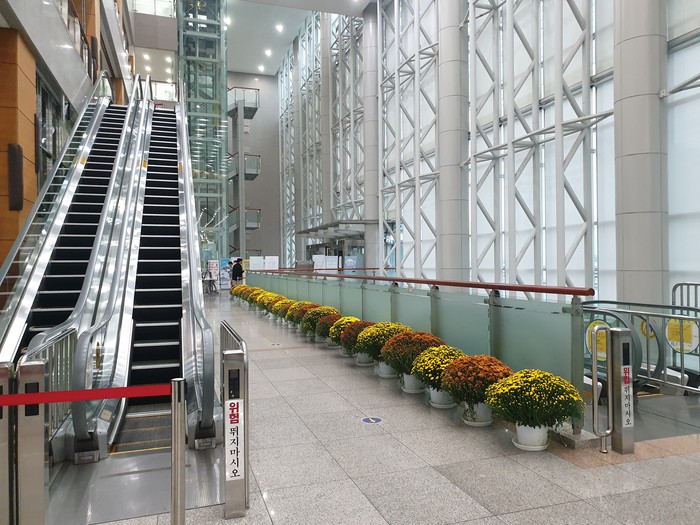 | ▲용인시청사 출입구에 비치된 국화 화분. |