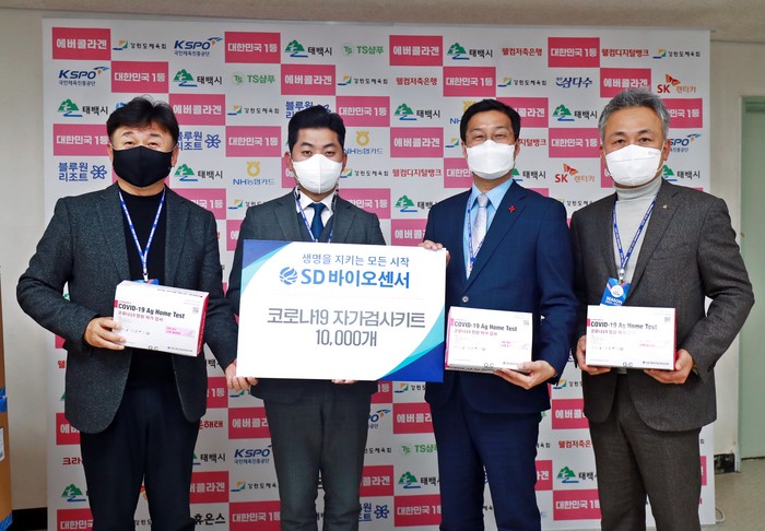 [로컬세계 박상진 기자]체외 진단 전문 기업 SD바이오센서(대표 이효근)는 지난 22일 태백 고원체육관에서 ‘코로나19 자가검사키트’ 1만개(시가 9,800만원 상당)를 태백시에 기증했다.