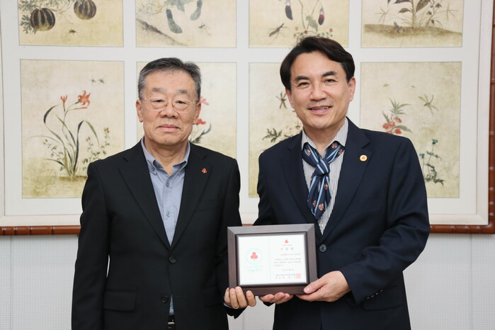 ▲ 100호 ‘강원 나눔리더’로 가입한 김진태 도지사(오른쪽)와 유계식 회장(사진=강원사회복지공동모금회 제공) |