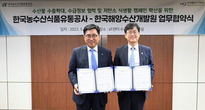한국농수산식품유통공사(사장 김춘진)는 18일 서울 양재동 aT센터에서 한국해양수산개발원(원장 김종덕)과 수산물 수출 확대와 수급 정보 협력, 저탄소 식생활 확산을 위한 업무협약을 체결했다.