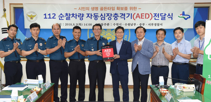 [로컬세계 주덕신 기자]경기 수원시가 2일 수원남부경찰서 소회의실에서 관내 112 순찰 차량에 비치할 자동심장충격기 23대를 전달했다.