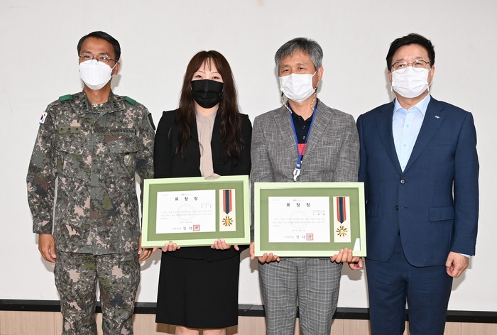 | ▲염태영 시장(오른쪽), 손대관 육군51보병사단장(왼쪽)이 표창을 받은 이들과 기념촬영을 하고 있다. |