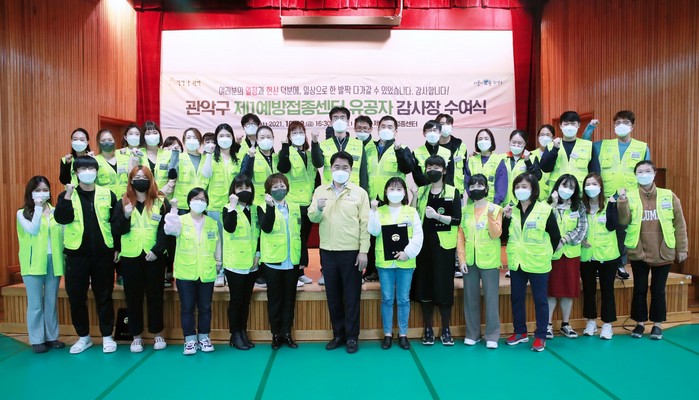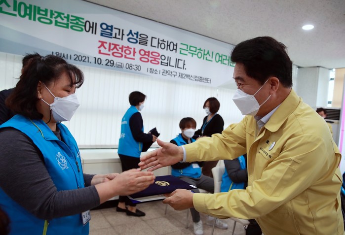 이날 박준희 관악구청장은 제1, 2예방접종센터를 방문해 최일선에서 백신접종에 최선을 다해 준 근무인력 132명에게 손수 감사장을 전달했다.