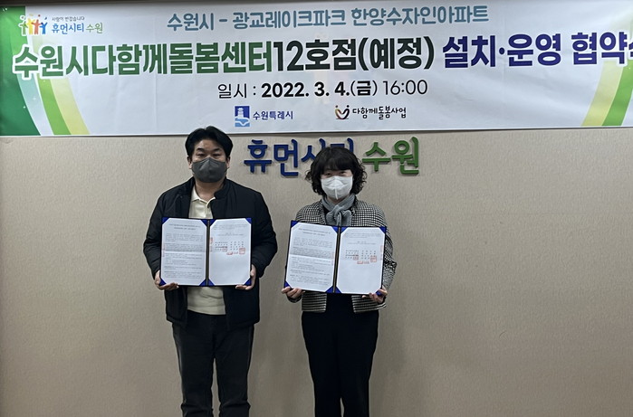수원시와 광교레이크파크한양수자인아파트 입주자대표회의는 4일 시청 보육아동과 사무실에서 ‘수원시 다함께돌봄센터 12호점 설치·운영 협약’을 체결했다.