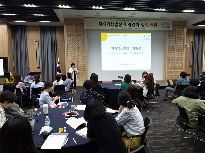 이번 행사는 박연희 이클레이 한국사무소장, 조현숙 수원시 지속가능전략팀장의 강연과 지속가능발전 목표 달성 방안을 논의하고자 마련됐으며 실무부서 공무원 100여 명이 참석했다.
