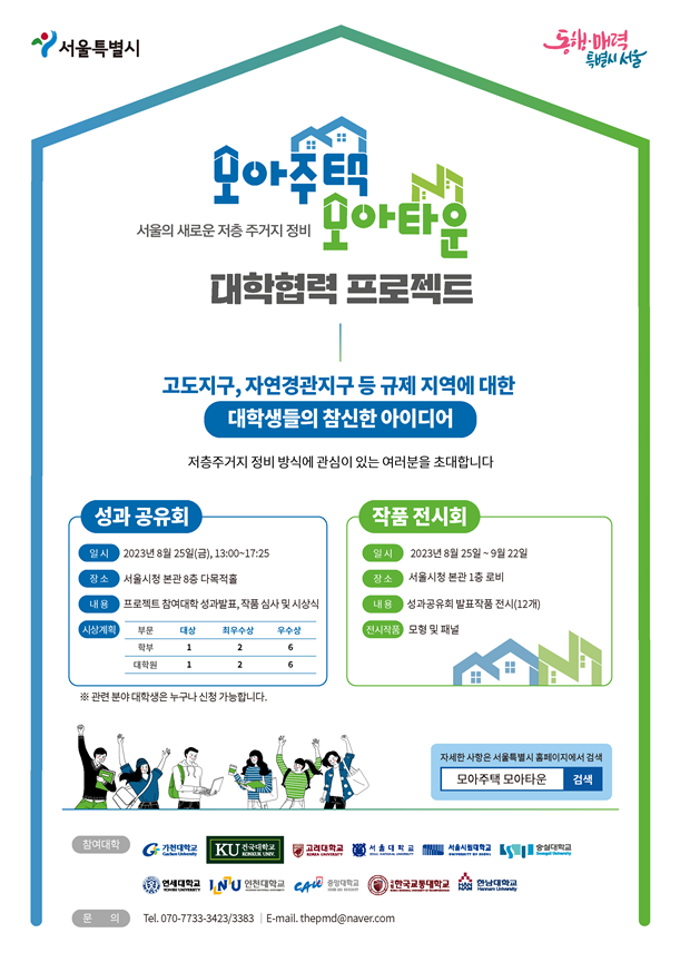 서울시는 오는 25일 서울시청 신청사(8층 다목적홀)에서 ‘모아주택・모아타운 대학협력 프로젝트 성과공유회’를 개최한다고 밝혔다. 시는 프로젝트에서 제안된 아이디어를 모형과 패널로 제작해 오는 25일부터 9월 22일까지 신청사 1층에 전시한다.
