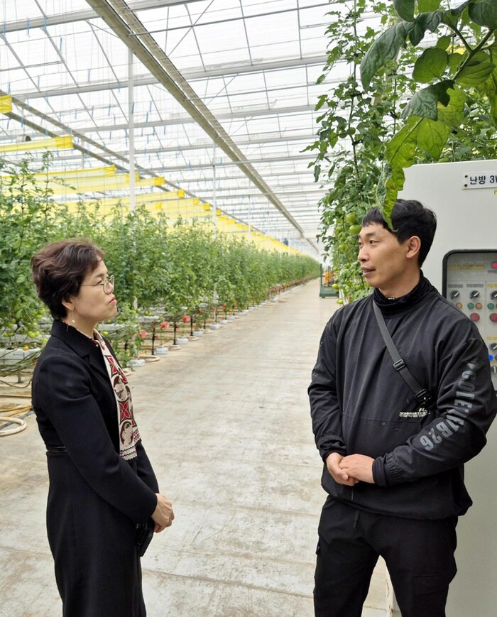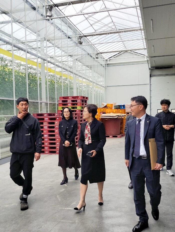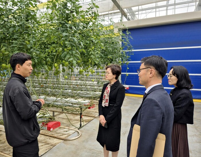 ▲농신보 조은주 상무와 농협직원은 25일 전북 정읍시 소재 스마트팜 우수기업에서 현장간담회를 실시했다. 강은구 ㈜이음농업회사법인 대표(맨 오른쪽), 조은주 상무(왼쪽) |