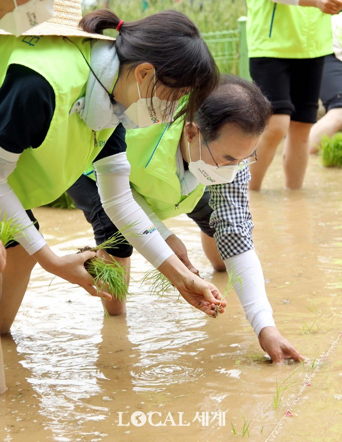 이날 이성희 농협중앙회장과 지난 12월 입사한 범농협 신규직원 5명은 손 모내기를 하며 전통 농경문화를 재현했으며, 코로나19를 극복하고 알찬 농사를 이루는 한해가 되길 함께 염원했다.