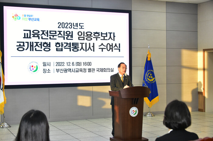 ▲하윤수 교육감은 6일 유.초.중등 교육전문직원 합격통지서 수여식에서 인사말을 하고 있다. 부산교육청 제공 |