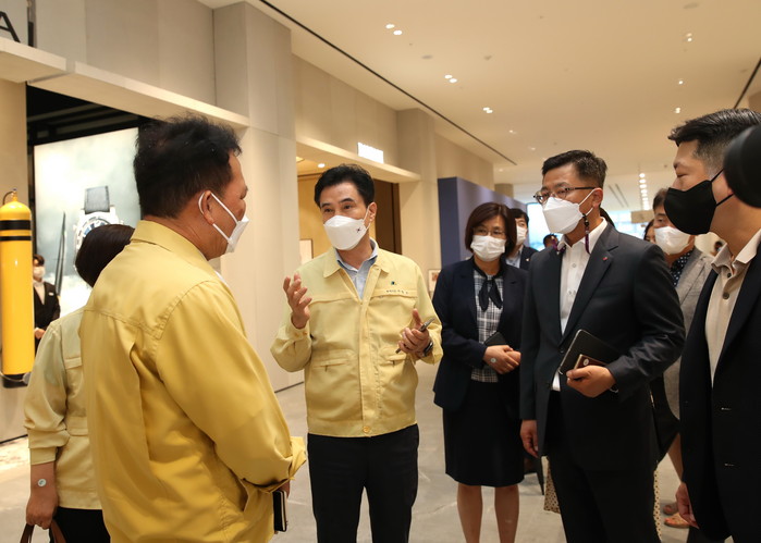 | ▲서철모 화성시장(왼쪽에서 두번째)이 20일 롯데백화점 동탄점을 방문해 코로나19 방역상황에 대한 현장점검을 실시하고 있다. 화성시 제공 |