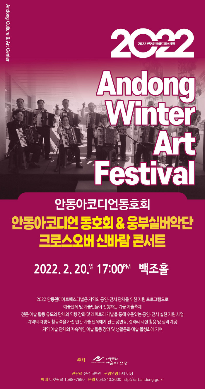 [로컬세계 이창재 기자] ‘2022년 안동윈터아트페스티벌’다섯 번째 공연‘안동아코디언동호회 & 웅부실버악단 크로스오버 신바람 콘서트’가 오는20일 오후 5시 안동문화예술의전당 백조홀에서 진행된다.